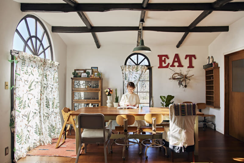 アーチ形の窓と梁がアクセ ントのダイニングは玄関ホールからキッチン、リビングへとつなぐ要の空間。私のお気に入りの場所です。