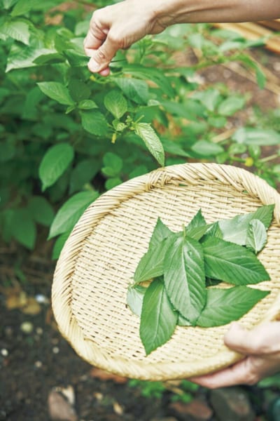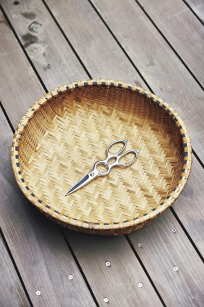 収穫に使うのは、篠竹という細竹を使った手製のかごと、分解して洗えるキッチンハサミ。