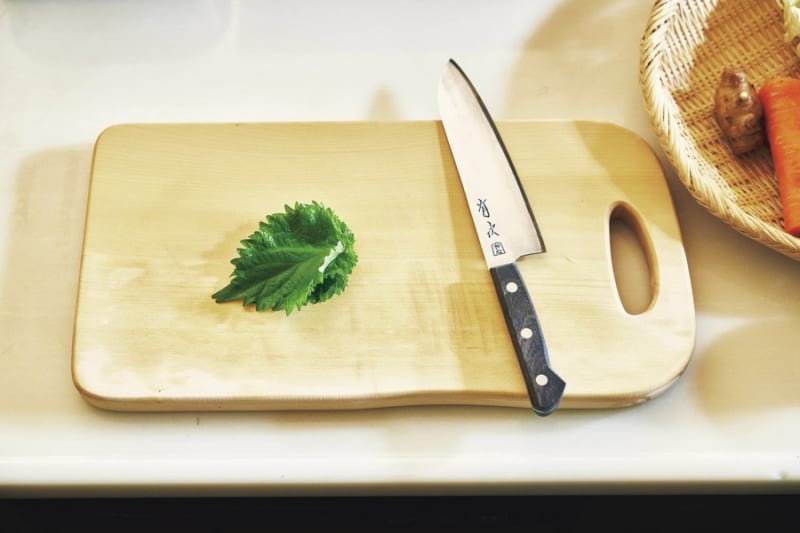 「ウッドペッカー」のイチョウのまな板は跳ね返りの感覚がやわらかく、疲れません。包丁は「有次」。トントンという音が心地よくて無心になれます。