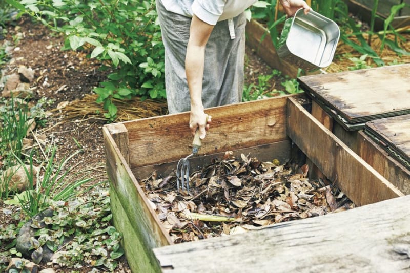 コンポスト歴は20年。落ち葉やぬかを入れた木箱に生ゴミを入れて日々かき混ぜていると、微生物が分解しふわふわの土に。