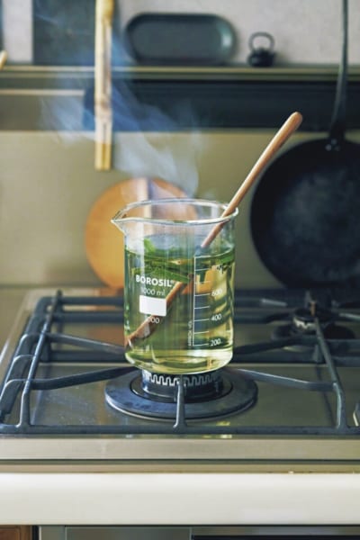 じか火にかけられる「BOROSIL」の実験用ビーカー。沸いたお湯でお茶を 。