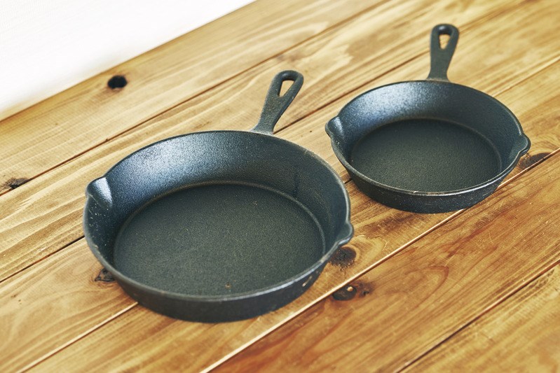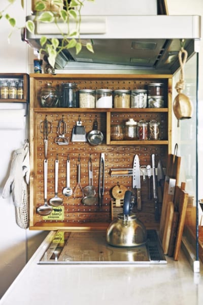 コンロ脇に作ってもらった有孔ボード棚にはキャンプ用の調理器具や調味料を並べて。