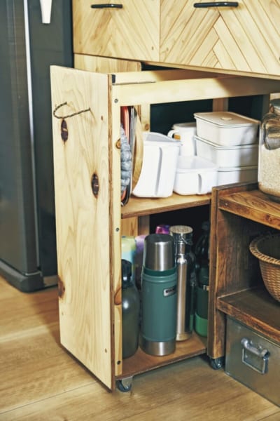 出番の多い水筒や保存容器類の収納に、使うときだけさっと引き出せるワゴンを作ってもらいました。