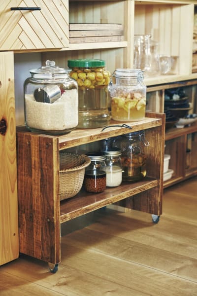 発酵調味料や果実酒を置くコーナーにもキャスターをつけてもらい掃除をしやすく。