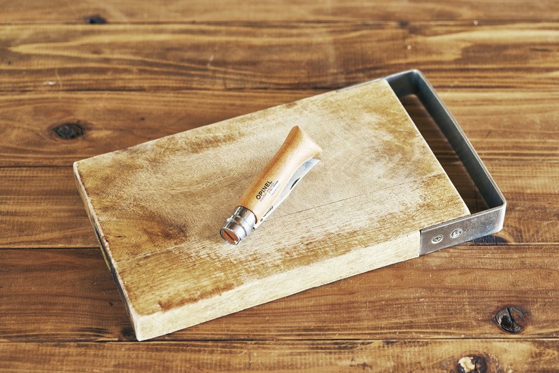 小ぶりで使いやすい「プエブコ」のまな板。「オピネル」のナイフは果物を切ったり、調理した肉を切り分けたりするのに重宝。