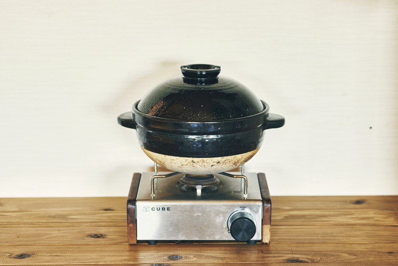 ご飯は土鍋で炊くので、「コベアキューブ」で火にかけています。