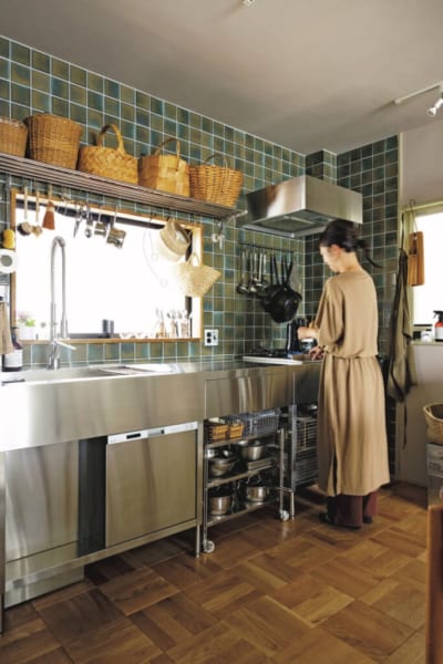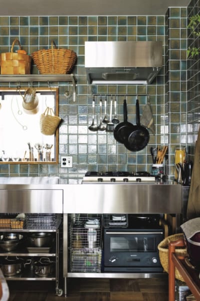 グリーン系で探した壁のタイルは、「平田タイル」のHabile。焼成の過程でできる自然な色ムラがお気に入り。 ステンレスのキッチンは「サンワカンパニー」のもの。