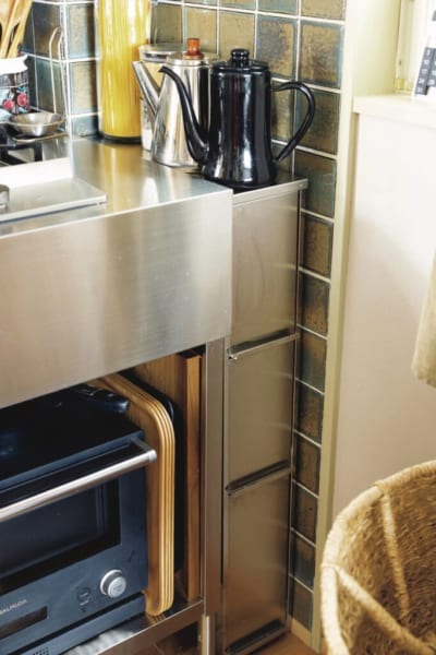 キッチンと壁の 15cm ほどのすき間に、「足立製作所」のステンレスラックがフィット。