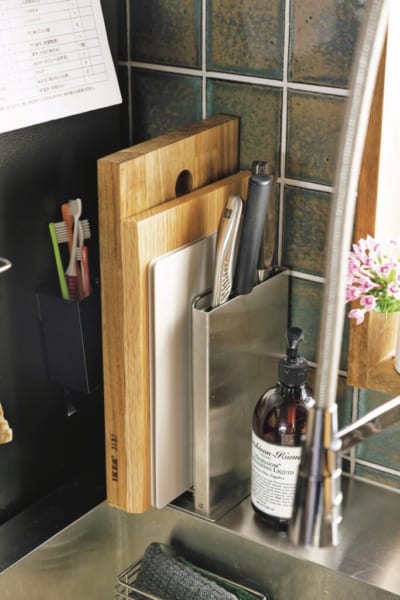 ステンレスの包丁スタンドも「足立製作所」のもの。