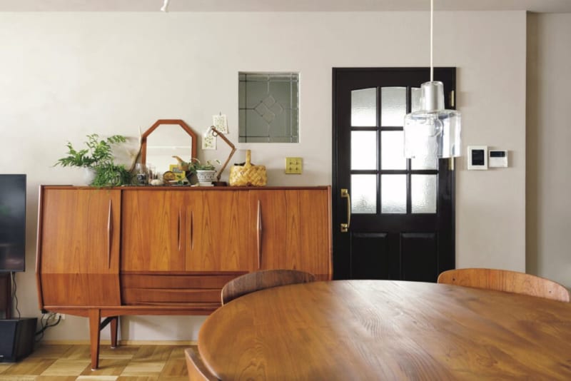 古い家具の木の色や風合いが好き。チェストはデンマークの 1960年代のもの。ドアは「ウェリントン」で購入したイギリスのアンティーク。