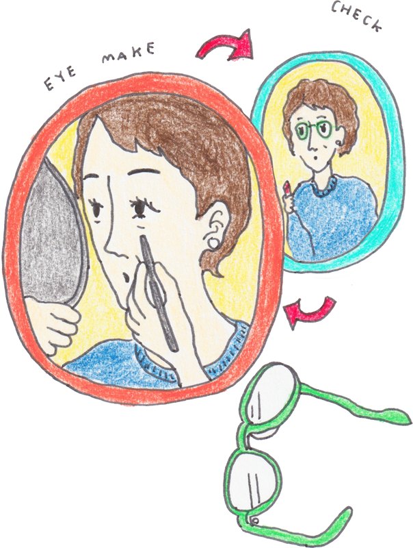 この連載の「鏡」の回でも書きましたが、メイクをするときは、細かい部分を映す手元用の鏡と、全体のバランスを確認する大きな鏡を交互に見る必要があります。だから我々メガネ女子たちは、メガネをかけたり外したりしながらメイクしなくてはならず、そりゃー大変なんです。