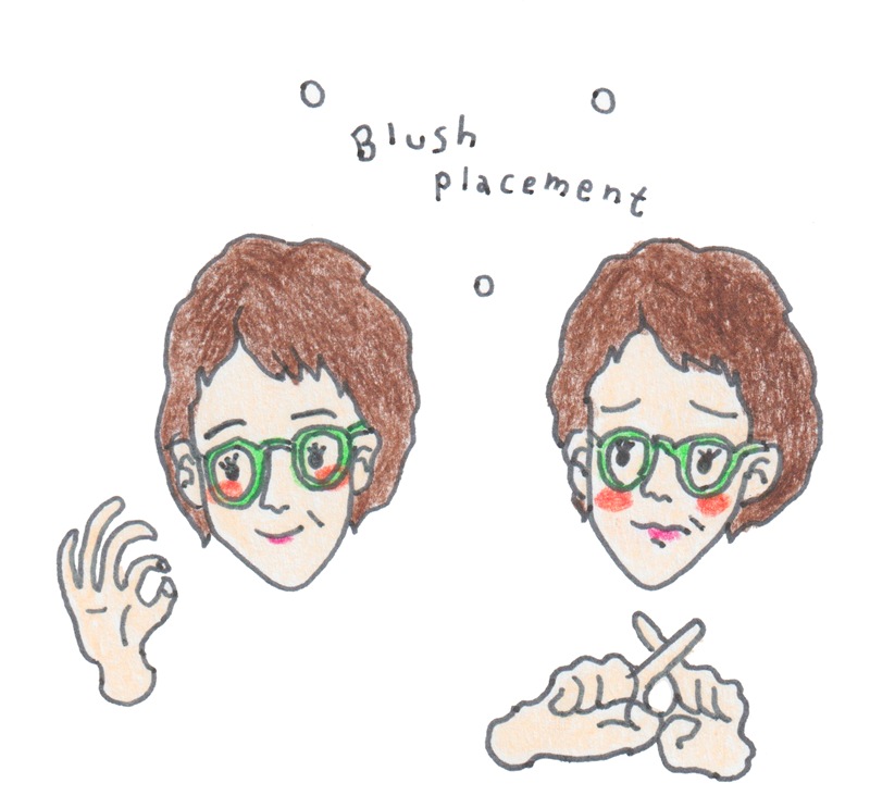 そしてチーク。こちらはまず、メガネを外してチークをのせたあと、メガネをかけて、メガネとチークとのバランスを確認。再度メガネを外して、チークの位置を調整して仕上げる……これが基本の流れです。