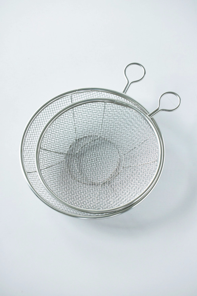 ステンレス製の浅い水切りざるは中(24cm)、小(21cm)をセットで。