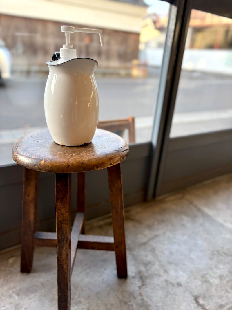 消毒液を乗せた丸椅子。