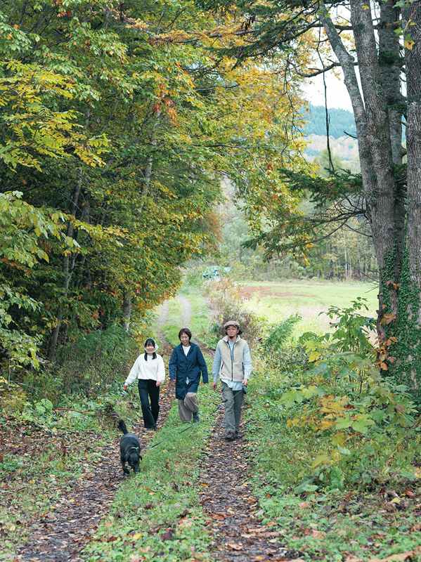 蘭越町に引っ越してきてから飼いはじめた犬のパウの散歩を兼ねて家族で散歩に。「ひとりで出かけるときも、ラジオや音楽は聴かずに自然と対話しています」と明子さん。
