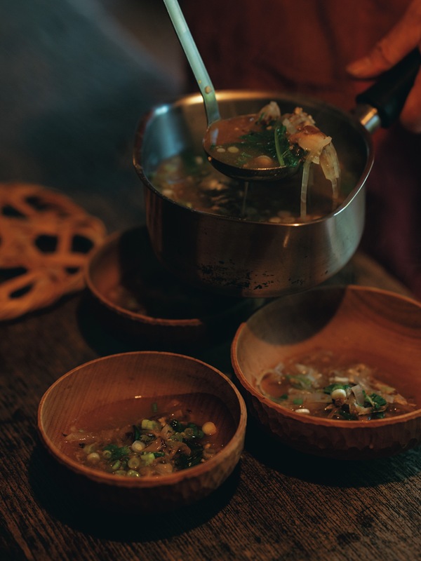 朝、家族のためにみそ汁を作るのは夫、伸也さんの担当。まずは、昆布と野菜、かつお節でだしをとり、旬の野菜を刻んで、黒千石大豆で作った自家製みそを溶いてでき上がり。