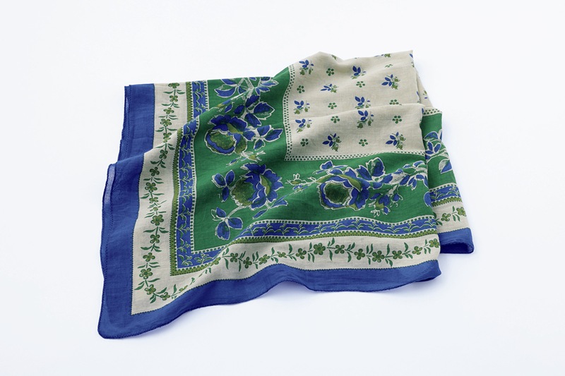 「ブリティッシュグリーンとブルーの配色がデニムにも映えます。大判ですが、やわらかいのでコンパクトに巻くこともでき、Tシャツ姿のアクセントにもなるすぐれものです」と馬場さん。90㎝×90㎝で、肌ざわりのやさしいコットン100%。