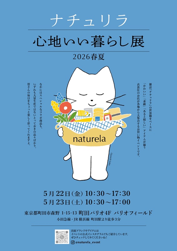 おかげさまで大盛況だった昨年11月の「ナチュリラ 心地いい暮らし展」。春夏の素敵なものをたっぷりとご用意して、今年も5月に開催します。会場は東京・町田のレトロビル「町田パリオ」。小田急線&JR横浜線の町田駅から連絡通路直結の好アクセスな立地です。『ナチュリラ』ならではの衣食住の素敵なものがズラリと並びます。また、EC同時販売の特別なコラボアイテムもご用意していますよ。ラインナップはイベントアカウント@naturela_event で詳しくご紹介しているので、ぜひチェックしてみてくださいね!