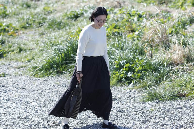 好きなのは、季節問わず着まわしができて、着心地のいい服という圷さん。暑い夏でも快適に過ごせるようにと、素材選びからこだわっているそう。「シンプルな装いが多いので、アクセントになる小物で変化を加えたりしています。ふんわりしたギャザースカートも好きですが、年齢を重ねた今はモノトーンでまとめるなど、甘すぎない着こなしを意識するようになりました」